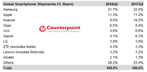 Xiaomi’s Q2 shipments jumped 60 per cent year-on-year to 23.2 million units. Its market share increased to 6.3 per cent from 4.1 per cent in Q2 2016. Oppo’s shipments increased by 33 per cent to 30.5 million units, while Vivo’s rose 45 per cent to 24 million. Both saw their market shares rise by about 2 percentage points to 8.4 per cent and 6.6 per cent respectively.