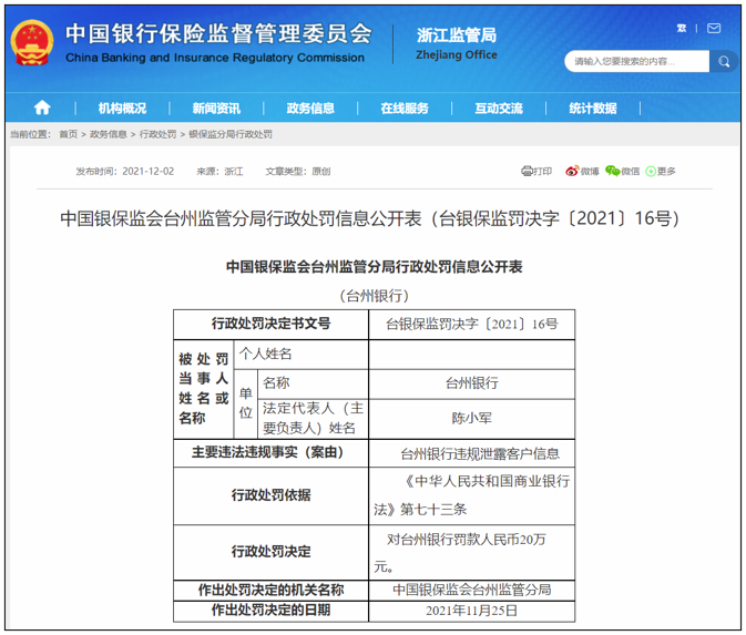 前言:中国银保监会台州监管分局的罚单显示,台州银行因“违规泄露客户信息”,被罚款20万元。