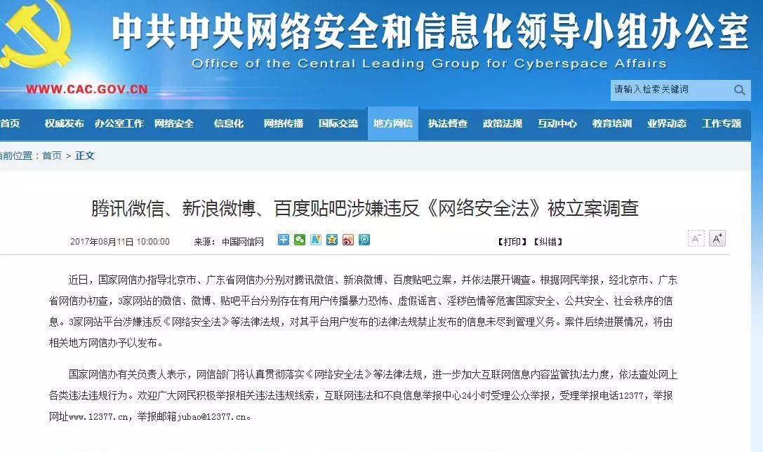 国家网信办通告 腾讯微信、新浪微博、百度贴吧涉嫌违反网络安全法