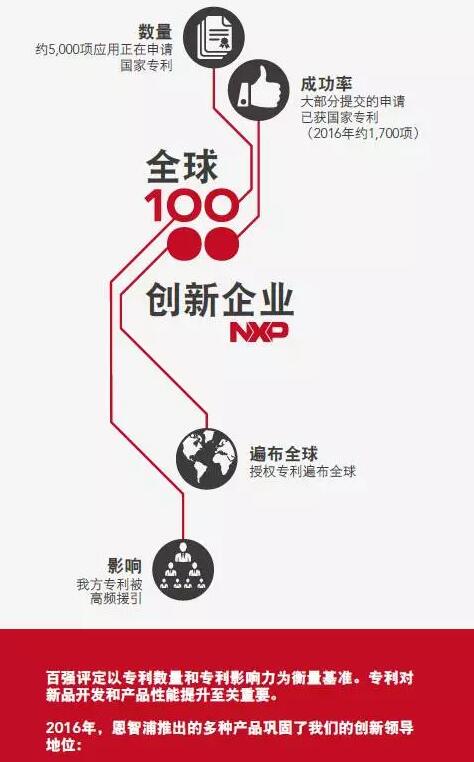 恩智浦的入选原因,包括其强大的专利产品等优势,如目前具9000多种专利系列产品。仅于2016年,公司就获得近1700项独立国家专利,另有近5000项其他国家专利应用正在申请中。如此大规模的专利活动,切实反映了恩智浦为市场提供创新产品的力度和规模,以及在电子行业的实力和领导地位 。恩智浦创新方案示例可参见2017年在拉斯维加斯的CES消费电子展期间(2017年1月4至8日)发布的最新产品。