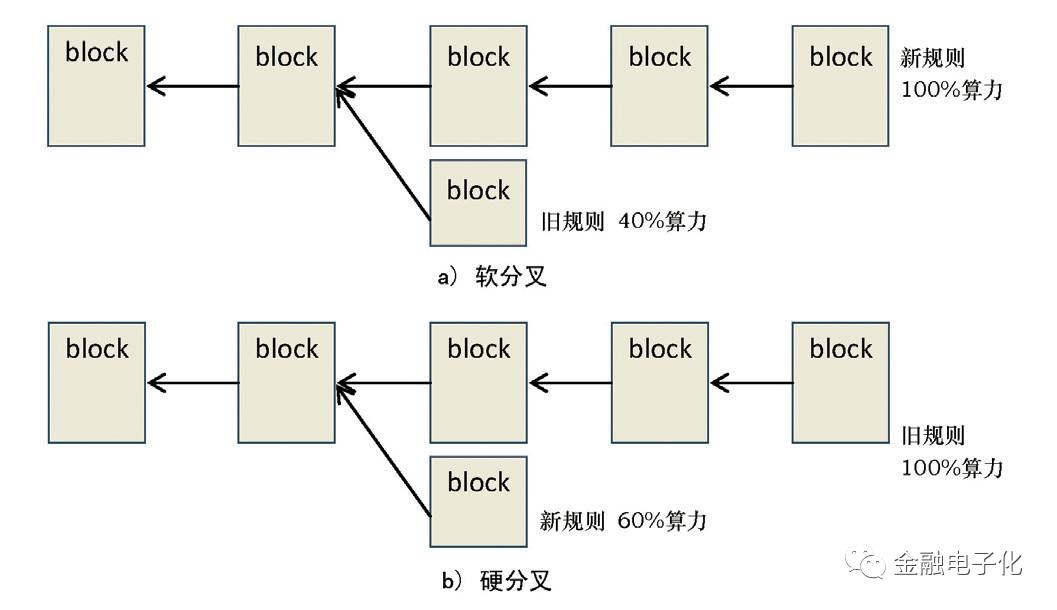 软分叉和硬分叉:分叉是指对区块链的规则做一些改变。由于软件更新,不同节点上运行的软件版本不同,导致其执行规则不同,从而导致分叉(软分叉和硬分叉)。软分叉是让原来可以被接受的交易或区块不可以被接受,例如:比特币中使用的P2PKH 脚本。与之相反,硬分叉是使原来不可以被接受的规则可以被接受,例如:增加区块大小。这两种分叉作用在区块链中时,软分叉可以很好地被老版本软件的节点兼容,并促进其更新软件,但硬分叉会受到排斥。图2 是有60% 算力占比的节点更新软件时,硬分叉和软分叉对新规则和旧规则支持情况。在更新区块链应用时,应该尽可能使用软分叉完成,避免硬分叉。