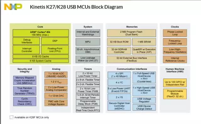 恩智浦基于ARM核的 Kinetis K27/K28系列微控制器提供1MB嵌入式SRAM内存和2MB闪存,系统能耗更低,电池使用寿命更长,能使便携式显示应用渲染出更加丰富的图形。