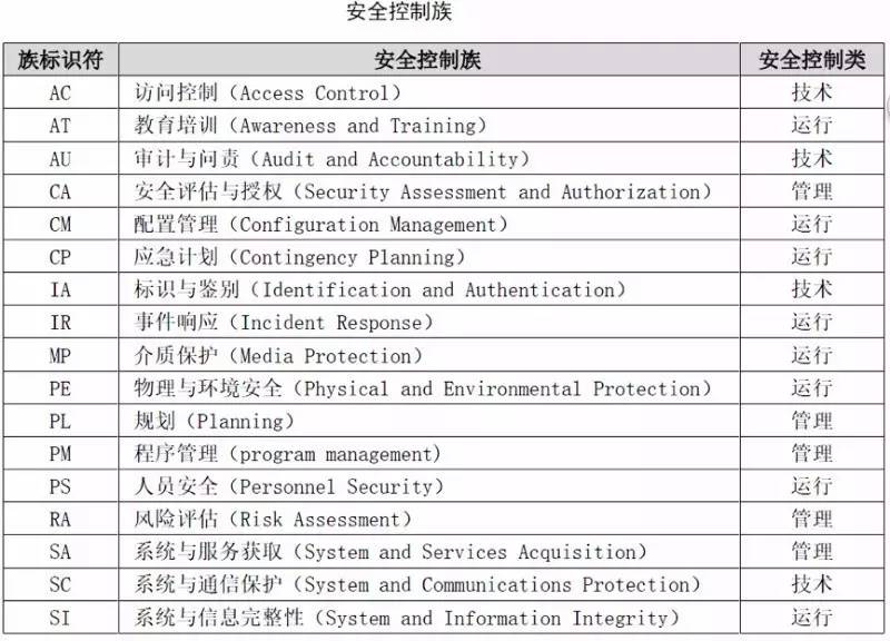 标准附录B中给出了可用于工业控制系统的安全控制列表。为了更方便地使用控制选择和规约过程,把控制概括为管理类、运行类和技术类,十八个族,每个族包含一些与该族的安全功能相关的安全控制。对于每项安全控制,有三方面的内容: