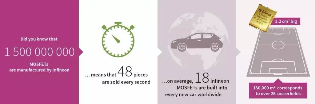 英飞凌汽车级 MOSFET 是领先技术与稳固可靠封装的结晶,性能一流。单在2015/2016这一个财年,我们就销售出超过15亿颗MOSFET器件,相当于每秒售出48颗。把它们排在一起,面积相当于25个足球场大小。