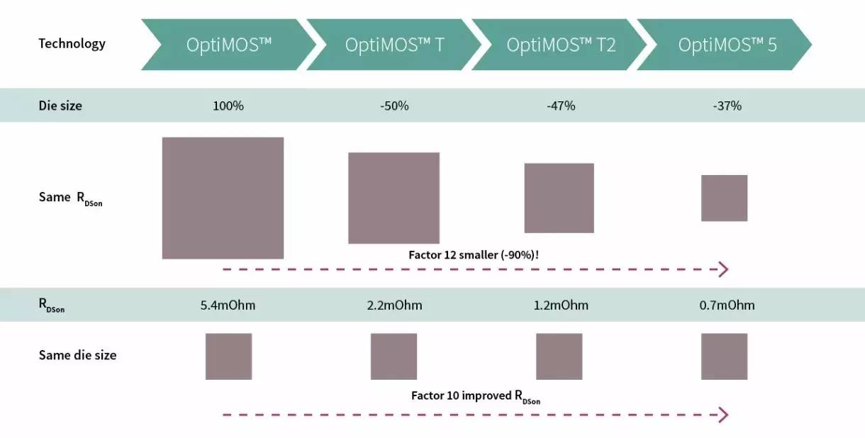 凭借封装改进和先进的芯片技术,英飞凌实现了从OptiMOS™ T2向OptiMOS™ 5的转化,产品的通态电阻减少了一半。具体地说,同类最佳的SS08封装40V OptiMOS™ 5产品与同类最佳SS08封装的40V OptiMOS™ T2产品相比,芯片电阻减少了30%,封装电阻减少了75%,杂散电感减少了50%。
