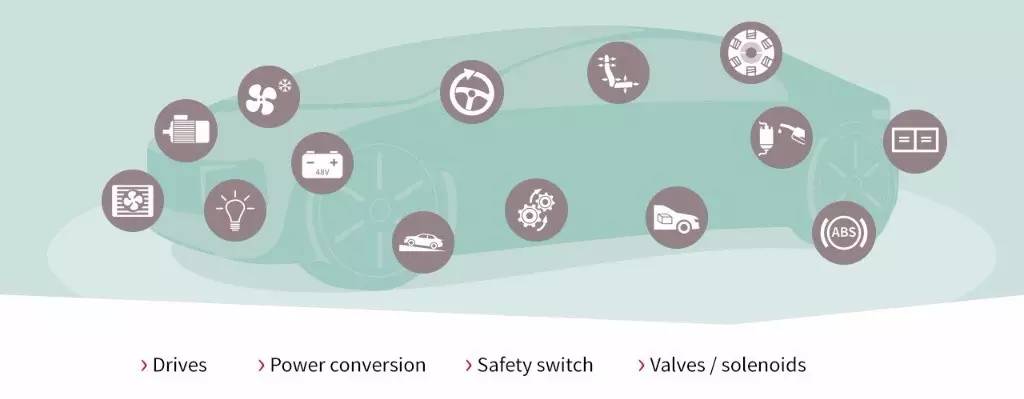 多个关键的汽车应用中均使用了英飞凌 MOSFET,这些器件用于驱动各种电动马达,可为各种装置提供动力,从加热、通风系统到车窗、挡风玻璃雨刮器。即使是座椅调节或天窗开关装置,都有MOSFET辅助驱动。在诸如电子助力转向 (EPS)、电制动和喷射系统等极其注重安全性的应用中,阀门也是由MOSFET驱动的。此外, MOSFET器件还可用作直流/直流转换器、电池管理系统和逆变器中的开关。