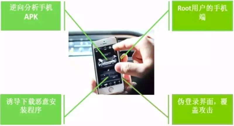 2016 年,研究人员测试了多家主机厂的远程控制 APP 的安全性,测试结果显示,目前市面上大多数远程控制 APP 居然连最基础的软件防护和安全保障都不具备,这就意味着通过 root 用户的手机端或者诱导用户下载 安装恶意程序,黑客可以很轻易地利用这些远程控制 APP 窃取用户个人信息及车辆的控制权,从而控制车辆开锁落锁,甚至启动引擎。