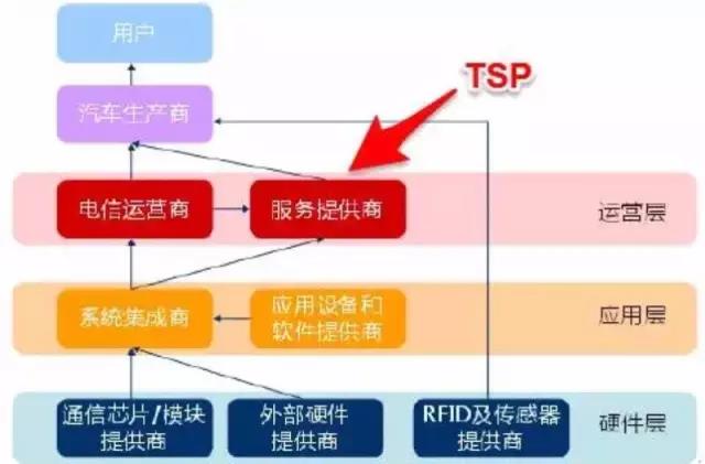TSP(Telematics Service Provider),汽车远程服务提供商,在Telematics产业链居于核心地位,在车联网架构当中起到的是汽车和手机之间通讯的跳板,为汽车和手机提供内容和流量转发服务,是车联网产业链最核心的环节之一。但由于TSP系统繁琐庞杂,车厂一般会把非核心边缘性、劳动密集型业务统统剥离,外包给多个供应商,或打包给一家TSP,由他们来集成各个供应商。