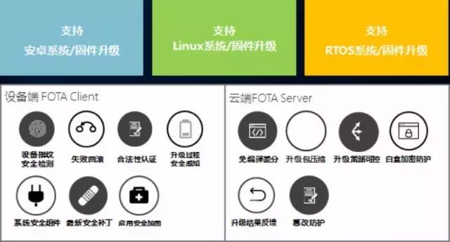 OTA安全升级,需要兼顾设备端和云端整体情况,一方面,对设备端合法性进行认证,支持失败回滚,如果升级失败了,系统能够自动回滚,以便能够恢复至升级前的状态。另一方面,对云端升级策略可控,加密防护,防止篡改。目前,市场上已经有OTA安全升级整体方案,这里笔者摘取了梆梆安全发布“物联网安全OTA升级平台”,如下图供大家参考。