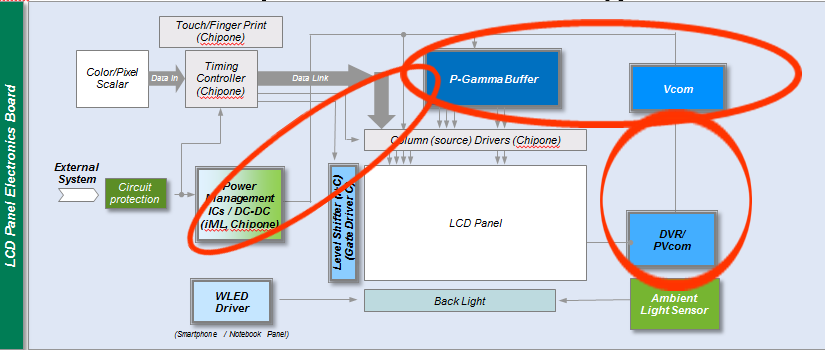 iML1998适用于大尺寸LCD显示屏,目前能够支持32寸及以上的HD、FHD、UHD解析度,支持窄边框的GOA显示屏,未来将在28寸以上多种尺寸的LCDTV产品量产。目前,单一方案可以适合所有的LCD显示屏,据预测,该产品将成为传统PMIC市场的关键增长点。