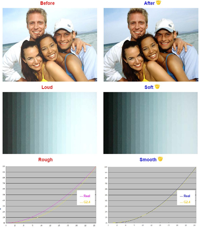 通过可编程P-Gamma调节技术,可根据环境光线实现动态的Gamma曲线调节,从而自动调节面板的明暗度,使眼睛感觉更舒适;