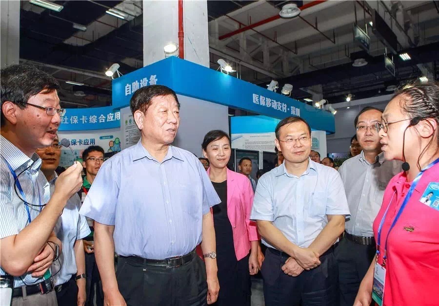 创新应用展现场,中组部副部长、人社部部长尹蔚民(左二)莅临指导,亲身感受自助制作一张内嵌华大芯的第三代社会保障卡,并用这张卡体验了小额支付服务,这是第三代社会保障卡创新应用亮点之一