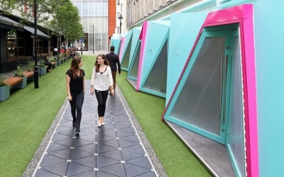 伯德街上最引人注目的是一块铺设了三角地砖的区域。和一般的地砖不同的是,当行人在地砖上走动时,位于砖块角落上的电磁感应器能够精确地将每一步都转化为5W的连续电流。这些动能转化而来的电力会通过蓝牙传输器,被输送到附近街道,为路灯提供电力。同时,电力还会触发街道上的背景音乐装置,在这片小天地里模拟出鸟鸣声。通行的人越多,越是充满野趣。