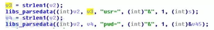 HTTP服务中出现的漏洞可以通过登陆处理用户名和密码的错误方式触发。用户在进行身份验证的时候,他们会在 GET 请求中传递 “ http:///?usr=&pwd=”的身份凭证。web 认证模块试图解析这些值的时候,“libs_parsedata”会复制栈上的两个参数的内容而没有检查实际的存储容量,所以会引发越界写入的问题。