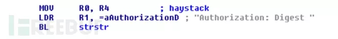 这个 RTSP 漏洞发生在 DESCRIBE 请求中的授权字段的处理中。首先“Authorization: Digest”字段需要先复制到缓冲区中,然后执行如下代码,R0就会指向 “Digest” 的开头。