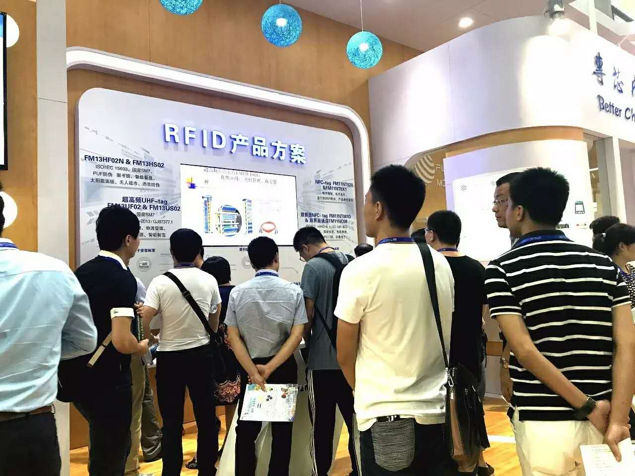 此次复旦微电子集团以七十二平米令人耳目一新的展台形象隆重亮相,展品重点为RFID不同型号和产品方案,包括PUF防伪标签、UHF点亮标签、防拆标签、NFC电子货架标签、NFC-tag等明星产品,同时,还展出了智能安全领域的金融、社保等行业应用卡片,手环,以及智能读写器具等芯片和系统解决方案。大量观众前来展台进行咨询和洽谈,氛围热烈,RFID产品广受瞩目。