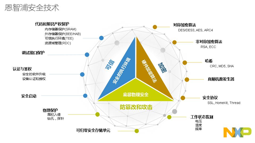 在SE和MCU+Sandbox(SW)两种安全解决方案基础之上,安全微控制器和安全处理器(S-MCU + TE)为用户提供了最高等级-金融级别的安全,包含LPC、Kinetis和i.MX等系列的相关产品,在智能家居中的软硬技术系统设计实现中,起到至关重要的安全防护作用。