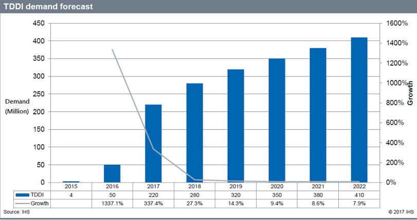 过去因 TDDI IC 单价偏高,导致整体 In-Cell 面板模组报价居高不下,但随着面板厂与 IC 设计厂商持续针对产品进行优化,TDDI IC 降价速度加快,也可望加速提升整体 In-Cell 的渗透率。预计 2018 年, In-Cell 方案的渗透率将达 37.6%,其中搭载 TDDI IC 的 In-Cell 产品比重也有机会提升至 22%。