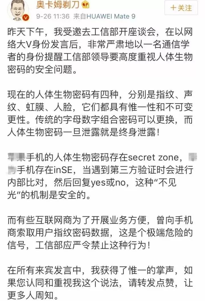 无独有偶,早在9月15日,2017年网络安全博览会暨网络安全成就展新闻发布会上,众人科技创始人、上海市信息安全行业协会会长谈剑峰就曾表示,目前所有互联网认证技术中,生物识别认证是最不安全的。