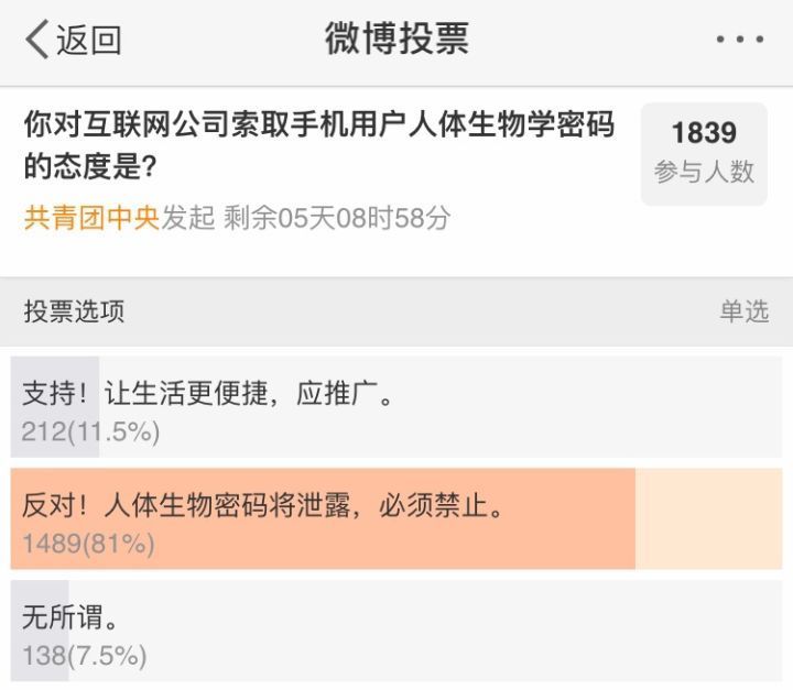 针对互联网公司通过指纹扫描、面部识别、语音识别等方式索取手机用户人体生物密码的安全性,@共青团中央 也在微博中发起了投票: