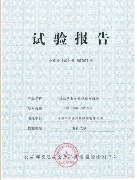 金溢科技委托试验的是汽车电子标识二代读写设备(VIR-GDGW-GVR1103),经检测,设备完全符合《机动车电子标识读写设备通用技术条件》(报批稿)规定的试验项目要求。