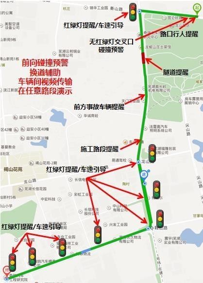 该条道路全长4.4km,涉及8个红绿灯路口和1条隧道,实现的V2X应用场景包括:(1)无红绿灯交叉口碰撞预警;(2)换道辅助/盲区监测;(3)前向碰撞预警;(4)车队间视频传输;(5)前方事故车辆提醒;(6)红绿灯信号提醒+车速引导;(7)隧道提醒;(8)施工路段提醒;(9)路口行人提醒。
