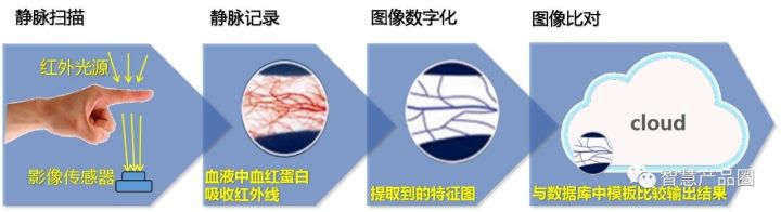 指静脉方案的原理是采用波长700—1100nm的红外光照射手指,手指内部静脉血管里的血红蛋白会吸收部分红外光,从而绘制出指静脉的图像。然后将图像数字化,并做特征提取,与已经记录的指静脉图像比对,完成识别过程。