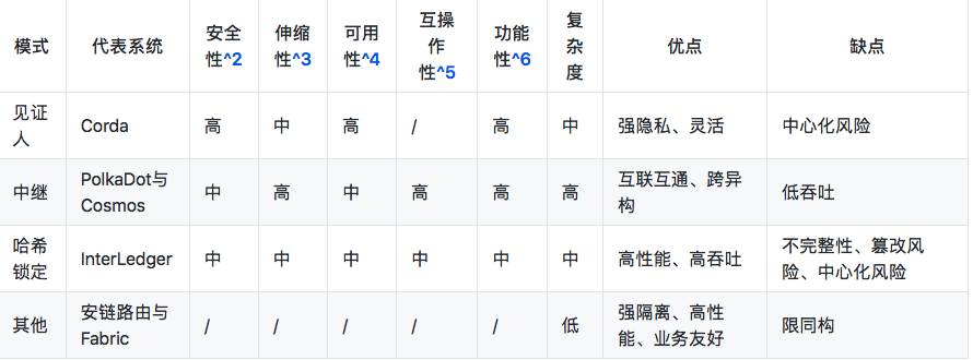在以太坊的Vitalik Buterin给R3的跨链报告中归纳了三种跨链技术实现模式,见证人模式、中继模式和哈希锁定模式,对三种模式的实现做了简要分析,同时也对不同模式支持的功能集合和实现难度做了总结。也指出了联盟链和公有链在治理模型和失败模型上的不同,联盟链相对公有链可以选择更强一致性的共识算法以提高跨链安全性,同时联盟链也拥有更高的可监管度,进一步增强了跨链安全性。同时也强调,跨链技术的研究实现需要根据落地的应用场景来开展,不建议盲目使用跨链技术。
