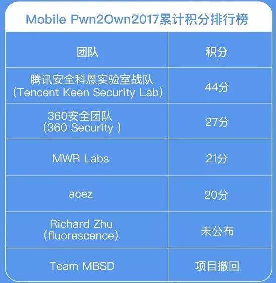 苹果、谷歌和华为等知名厂商在大赛前一晚纷纷发布修复补丁,但也没能阻止技术高超的黑客们。他们针对三星 Galaxy S8、iPhone 7 和华为 Mate 9 Pro 等移动设备中的浏览器、短距离通信(Wi-Fi,蓝牙和NFC)、短信和基带组件等进行破解,且大多都获得成功。最终,腾讯科恩实验室获得比赛的总冠军,360 安全团队获得第二名。