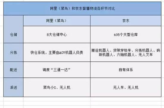从上面的对比不难看出,主打物流平台的菜鸟,在建设仓储中心的同时,可以借助合作伙伴“三通一达”已有的中转站,形成多点覆盖网络。而在配送和派送上,采取众包式的菜鸟主要负责挖掘大数据信息,为各大仓储中心间的物流调度作出最优的选择。所以,菜鸟要做的是关键点和关键技术,它不必在全国范围内广泛布局,也不必对配送机器人和无人机进行大规模量化。而京东走的是自建物流体系,仓储建设上肯定比菜鸟要下更大力气,对无人车和无人机需求也比菜鸟更强烈。