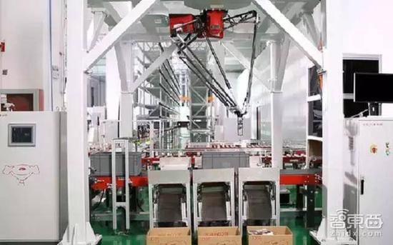 京东无人仓内六轴机器手臂在码放货物,右侧货架由Shuttle货架穿梭车负责搬运