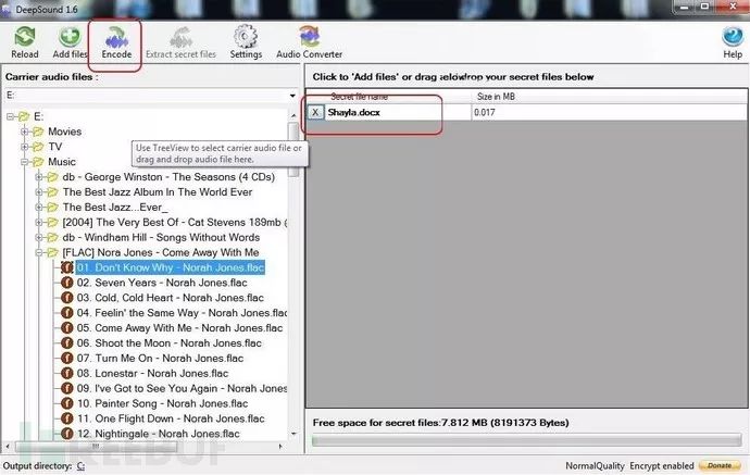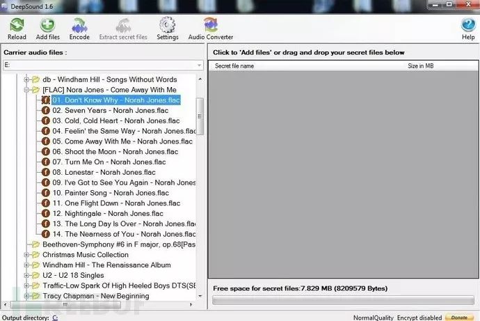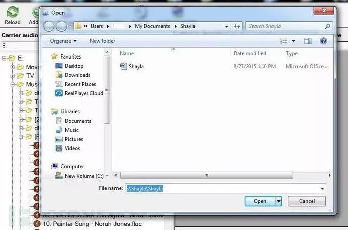 接下来,我们需要选择音频文件来隐藏数据。由于我的大部分音乐都是.mp3格式,所以这些音乐都没用。不过我有一些.flac格式的Nora Jones,可以在这里用。(一般来说,发烧友喜欢使用.flac,因为它的音质超棒,但是由于它未被压缩,因此文件会大得多。这就是为什么大多数移动音频设备使用.mp3文件)。