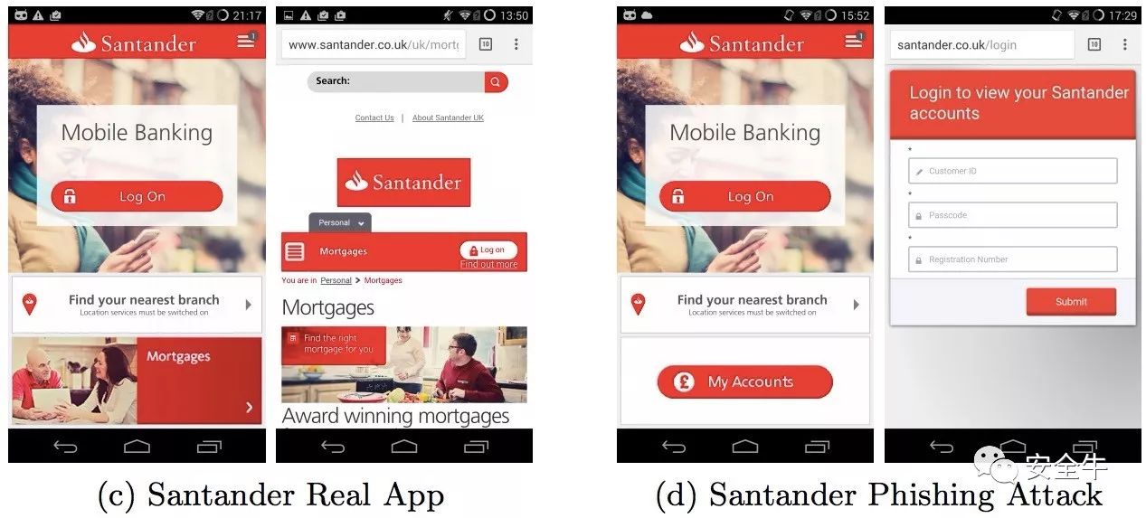 该安全弱点为攻击者创建了一个可能的机制——只要接入所害者所处相同网络(如同个WiFi热点),攻击者就可执行“中间人攻击”并收获用户凭证,比如用户名和口令/PIN码。研究人员还发现了其他潜在的攻击渠道,包括在桑坦德银行和爱尔兰联合银行的软件产品中执行某些“App内网络钓鱼”活动。