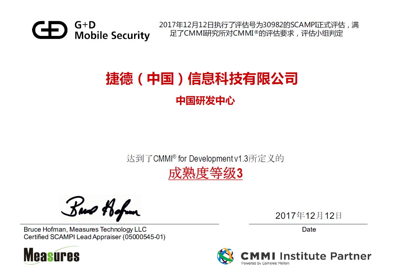 (捷德中国CMMI L3认证证书)