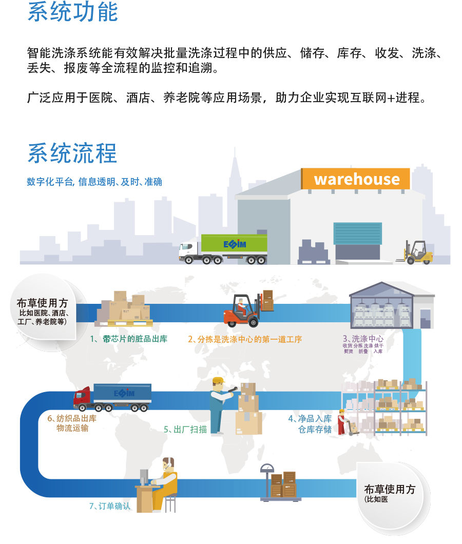 智能洗涤系统能有效解决批量洗涤过程中的供应、储存、库存、收发、洗涤、丢失、报废等全流程的监控和追溯,广泛应用于医院、酒店、养老院等应用场景,助力企业实现互联网+进程。