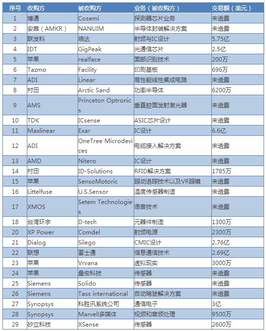 今年各大科技公司收购大戏不断上演,截至2017年12月,全球半导体产业共发起并购案超过55起,数量上较2016年多。2017年发生了史上最大的半导体并购案“通(博通)通(高通)合并”,虽然此次交易目前还面对着重重困难,能不能并购成功也是未知数。但也让看官过了把瘾,只等这次合并什么时候落地。此外涉及资金最大的是SK海力士180亿美元收购东芝存储器业务。