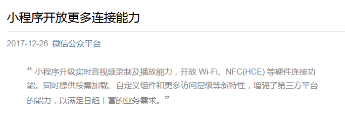 26日,微信小程序对外发布消息称开放更多连接能力,具体内容为“小程序升级实时音视频录制及播放能力,开放 Wi-Fi、NFC(HCE) 等硬件连接功能。同时提供按需加载、自定义组件和更多访问层级等新特性,增强了第三方平台的能力,以满足日趋丰富的业务需求。”