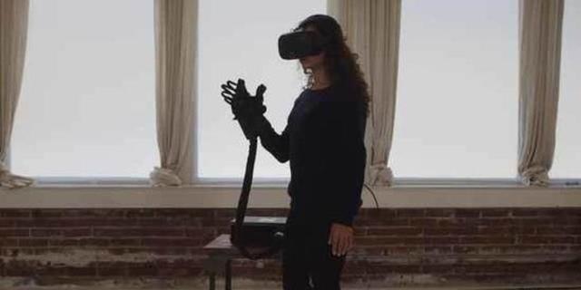 我使用的是 HTC Vive 头显,通过电线连接到大盒子上。该盒子控制空气流入手套,手套上有一个定制的传感器。手套在手掌和手指上有嵌板,可让你感受物体的形状纹理。手指上有一个外骨骼装置,带有微流控执行器,当你抓东西的时候,外骨骼可给你的手指提供力反馈。