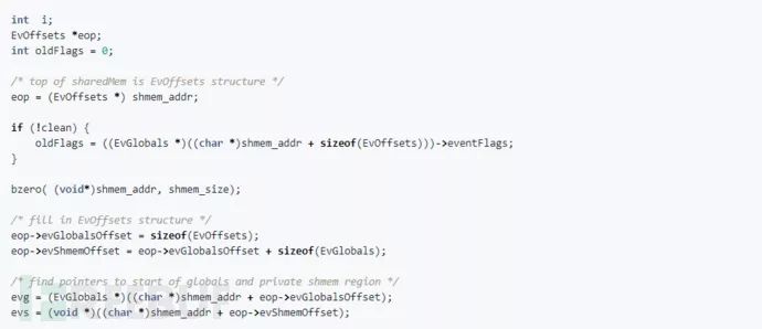 如上图所示,eop->evGlobalsOffset = sizeof(EvOffsets);和evg = (EvGlobals *)((char *)shmem_addr + eop->evGlobalsOffset);这两行存在问题。