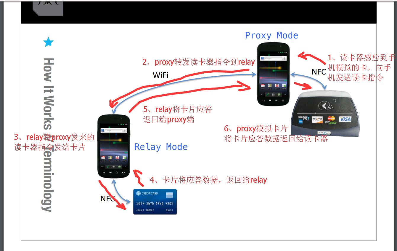 btw:这个方案15年我就在用,只是工作测试pos需要,偶尔用到感觉很方便,最近又用了一次,下决心整理一下。之前都看大神的文章,自己也为社区贡献一次。软件本身还有很大潜力可以挖,比如动态修改交互数据什么的。。。。。。你们懂的,不要乱来哦,会查水表的。另外也发现有一些终端读卡会采用一些奇怪的模式,导致软件报错,这时候只能再用proxmark3暴力监听了,但这个mitm的方式比proxmark方便多了,也便宜的多了哈。最后附一张ppt里的图,我简单画了一下,方便大家理解