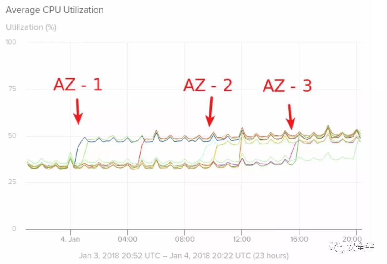 该公司还观察了其弹性计算云(EC2)实例在不同AWS可用域上随该补丁的推出而产生的CPU使用率变化(如下图所示),结果并不好看: