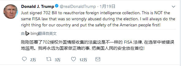 cnbeta称据外媒报道,当地时间1月19日,美特朗普总统宣布他已经在对《 外国情报监控法 (FISA)第702条修改再授权法》上签名,也就是说,这个备受争议的新监控条款成为法律。获悉,最新授权将在2023年12月到期。
