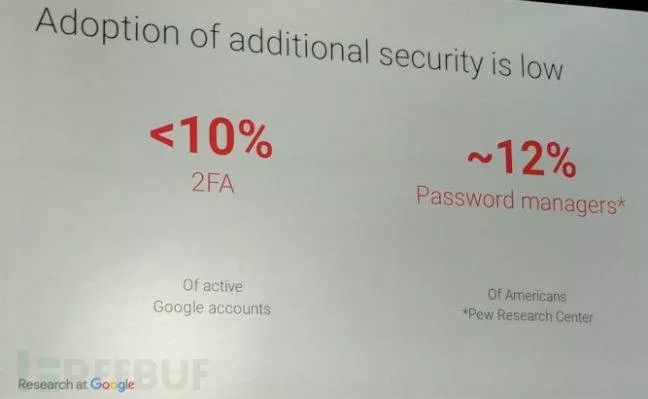 而 2018 年 刚刚召开的Usenix Enigma 安全峰会上,谷歌工程师也在演讲时道出了谷歌用户的安全意识现状,可以看到情况并不乐观——尽管早在 7 年前谷歌就开始引入了两步验证(2FA)功能,但目前有效的谷歌账户中,少于 10% 的用户开启了两步验证功能对账户进行保护;而使用密码管理器的用户在整体仅占12%的比例。