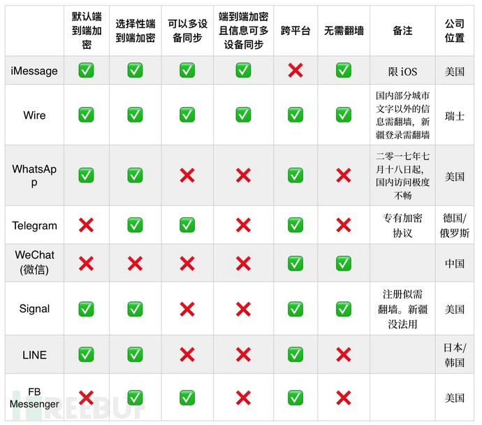 从苹果系统上的 iMessage,广为人知的WhatsApp、再到俄罗斯的 Telegram、或斯诺登代言的 Signal、来自瑞士公司的Wire、还有Line、Kakao Talk、FB Messenger等,无一不默认使用端对端加密或提供端对端加密选项。
