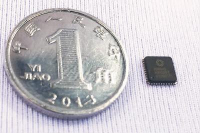 2017年9月16日,全球首个支持新一代北斗三号信号体制的高精度导航定位芯片正式发布。图为支持新一代北斗三号信号体制的高精度导航定位芯片与1角硬币的对比照片。
