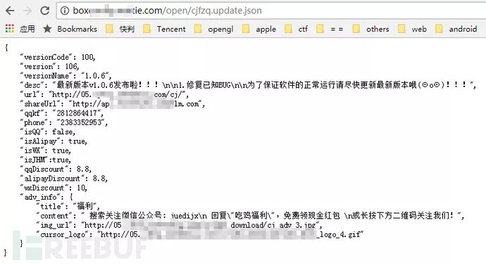 版本信息通过url拉取,为http://box*tie.com/open/cjfzq.update.json