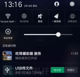 3. 点击开启辅助后,通知栏会有一个常驻通知“吃鸡辅助器 服务-辅助服务已开启”,但从反编译的代码看,除了弹常驻通知,并没有其他操作,且所有游戏外挂功能都是同样的处理逻辑。
