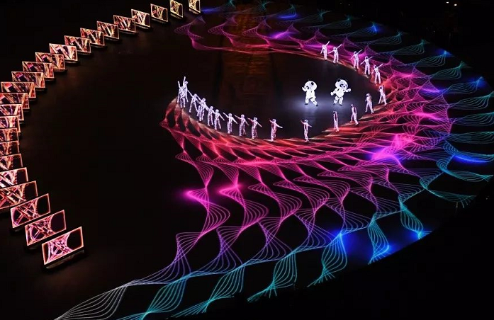 擅长使用“人海战术”表现宏大场面的导演张艺谋,摒弃此前的创作方式,在当日的演出中精简演员数量,大量采用科技手段——世界上最大却又最轻的熊猫木偶、可以与人共舞的机器人、可以实现透明图像显示的冰屏、先进的影视虚拟制作技术和数字表演与仿真技术……14年前雅典冬奥会上“北京8分钟”的京剧、红灯笼和茉莉花,传递的是上下五千年的中国文化;如今的互联网、机器人和人工智能,展现的却是更加自信的中国力量!