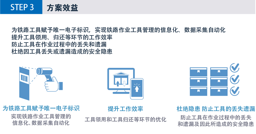 对于这类问题上海一芯智能科技股份有限公司提供了铁路工具RFID智能防丢系统,该解决方案采用RFID电子标签对维护工具进行唯一标识,借助专用设备动态采集数据,确保铁路维护人员在工具领用、作业转移、工具归还等环节的工具的完整性和一致性,杜绝因工具丢失或遗漏带来的安全隐患。