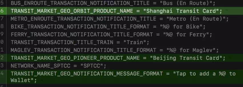 在这些测试版的开发信息中,我们看到了苹果即将加入对交通市场的支持,“Shanghai Transit Card”“Beijing Transit Card”的字样我们可以大致推断至少支持北京、上海两个地方的交通卡支付。其中包括对公交、地铁、渡轮、自行车、磁悬浮的支持。